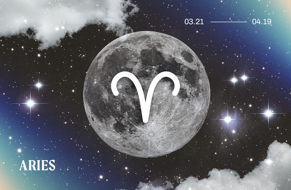 aries zodiac sign symbol on graphic background with the moon and clouds