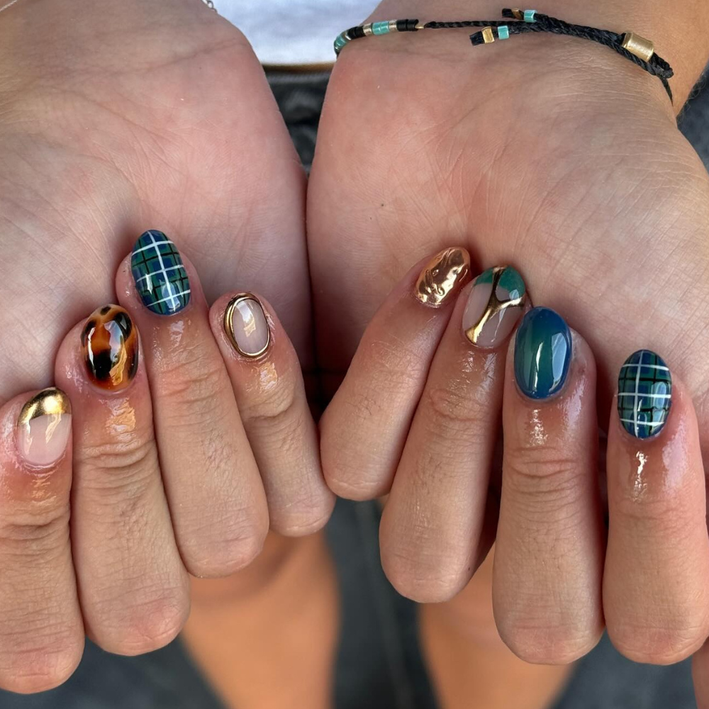 “This winter season’s nail trends are all about embracing rich, bold hues with a sophisticated twist,” says Huber-Millet. This mismatched plaid nail look by @nailedit_byash does just this and more, with contrasting deep teal tones, plaid patterns, and reflective gold chrome.