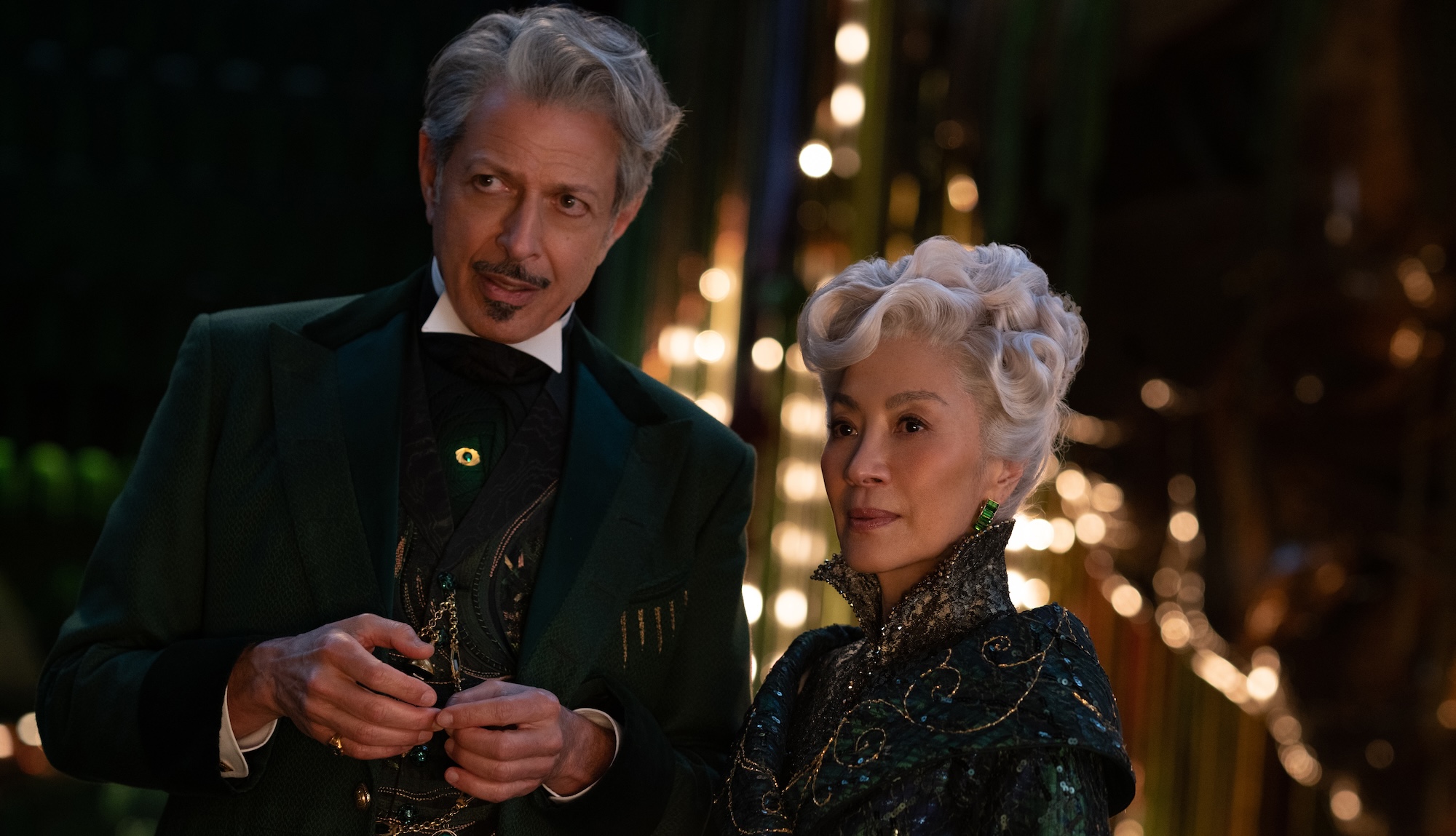 Wicked is not about Donald Trump. But it paints a picture of rising fascism and bigotries that remarkably resemble the vision of America Trump is selling. The film elevates the 1930s elements, with Michelle Yeoh’s far chillier Madame Morrible using a microphone that wouldn’t look out of place in front of Joseph Goebbels. And this only occurs after a new sequence of her flying monkeys taking on the shape of the S.S. as they come eagerly after Elphaba. Meanwhile, during the Wizard’s most innocent musical moment in this film, Goldblum’s silhouette waltzes with a globe of the moon, not unlike Charlie Chaplin’s venomous caricature of Adolf Hitler in The Great Dictator (1940) dancing with a balloon replica of the world he wishes to rule.